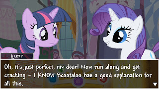 As another example, within locations, there’s a check to see whether there’s an encounter ongoing; if so, the location just updates and draws that encounter, whereas otherwise it accepts keyboard input to move the player character (Twilight) around the scene. We want to make it so that the player can click on one of those and have Twilight either comment on the foreground element or start a conversation with a character. In order to accomplish this, given this design, all we need to do is load the encounter associated with the foreground element or the character, and the location will then just automatically do the right thing since encounters are also self-contained objects that run themselves. If we didn’t do this, then we’d have to specifically worry about all the details every time, which is not something you want to do in a software project – that very quickly becomes unmaintainable.